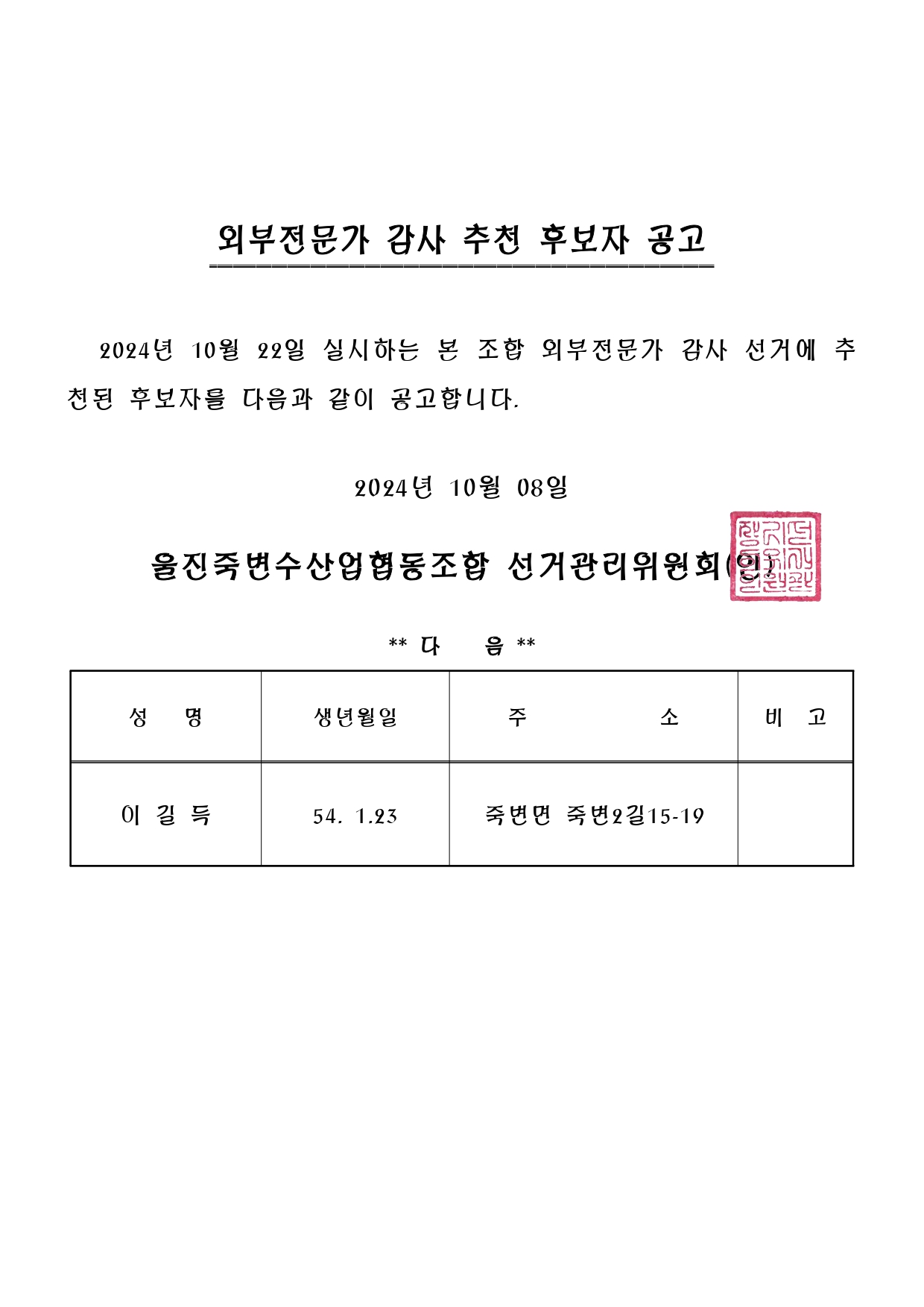 2024³â ¿ïÁøÁ׺¯¼öÇù ¿ÜºÎÀü¹®°¡°¨»ç ¼±°Å Èĺ¸ÀÚ µî·Ï °ø°í